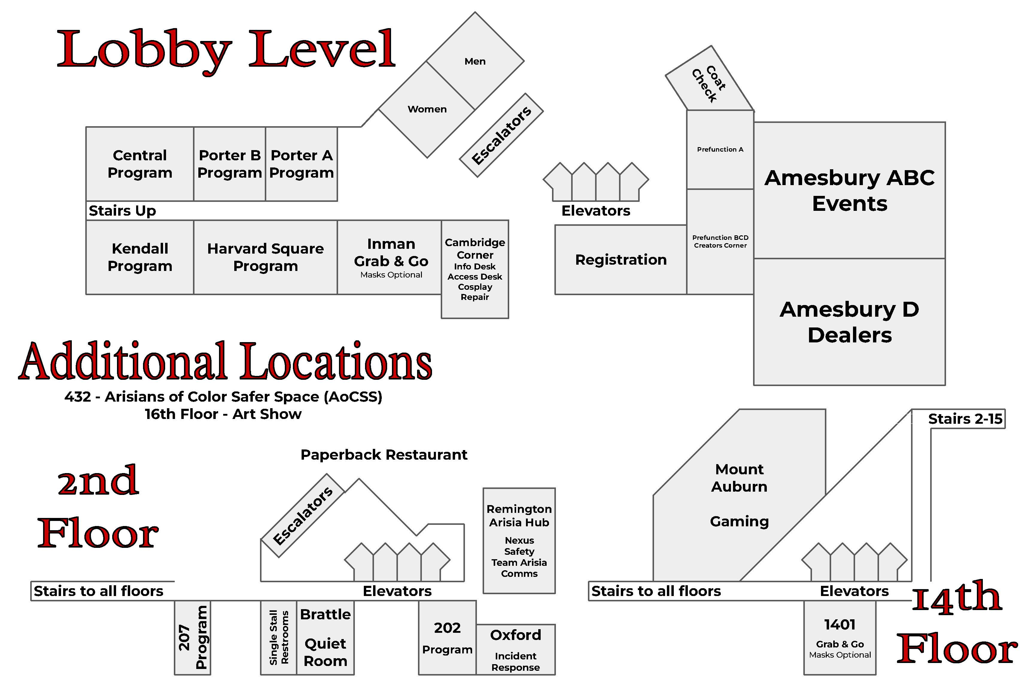 Below is Arisia's view of the hotel. The map is annotated with Arisia's 2025 room usage. We will update this page with the 2026 locations prior to the convention.